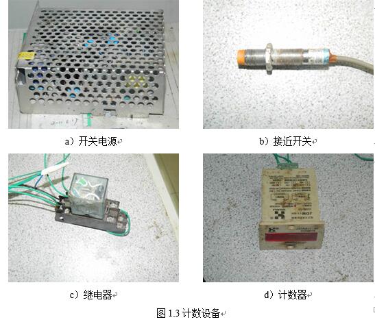 計數(shù)設(shè)備由開關(guān)電源、繼電器、計數(shù)器和接近開關(guān)組成,各部分見圖1.3。在偏心輪上粘貼一塊鐵片或者鋁片(見圖1.2(c)),當(dāng)鐵片或者鋁片經(jīng)過接近開關(guān)時,繼電器被觸發(fā),計數(shù)器數(shù)字增大一個,如此來記錄偏心輪轉(zhuǎn)動的圈數(shù),即加載次數(shù)。