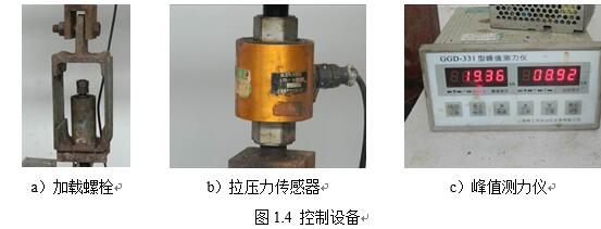 控制設(shè)備包括加載螺栓、力傳感器以及峰值測力儀等組成,見圖1.4。峰值測力儀采用上海梅立克自動化儀表有限公司生產(chǎn)的型號為GGD-331峰值測力儀,力傳感器為5t的拉壓力傳感器。旋轉(zhuǎn)加載螺栓對加載最大荷載進(jìn)行控制,加載的最大荷載經(jīng)拉壓力傳感器的感應(yīng),從峰值測力儀顯示最大力。峰值測力儀左側(cè)顯示的是每次循環(huán)加載中的最大荷載(小于10kN不顯示),右側(cè)圍動態(tài)顯示實時加載力。